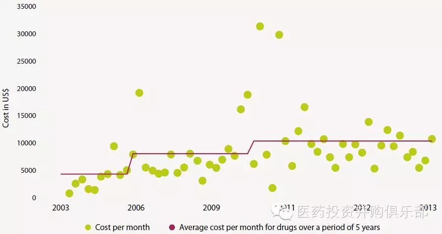 以美国为例,2013年抗肿瘤品牌药(即专利药)患者月均花费约1万美元,较2003年月均5000美元相比实现翻番,个别抗肿瘤药品月均消费甚至超过3万美元。