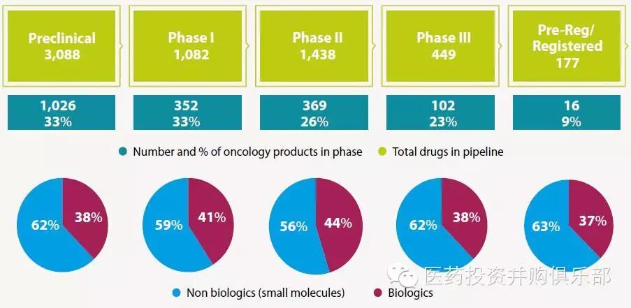 抗肿瘤药物是各大制药企业的研发重点,目前全球共有6234个处于活跃状态的在研新药,其中抗肿瘤药物接近2000个。在临床前、临床一期阶段,33%的在研新药均为抗肿瘤产品;但在晚期开发阶段,这一比例逐步下降,于此我们也不难看出抗肿瘤药物研发的难度。