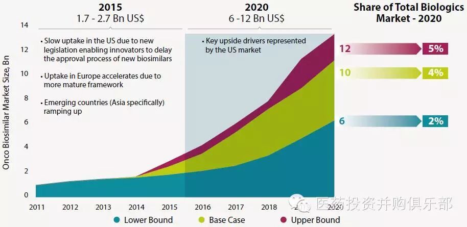 根据IMS的预测,2020年全球抗肿瘤生物仿制药市场在60-120亿美元之间,约占全球生物制品市场份额的2%-4%。从市场规模的角度看,美国将是全球最大的生物仿制药市场。
