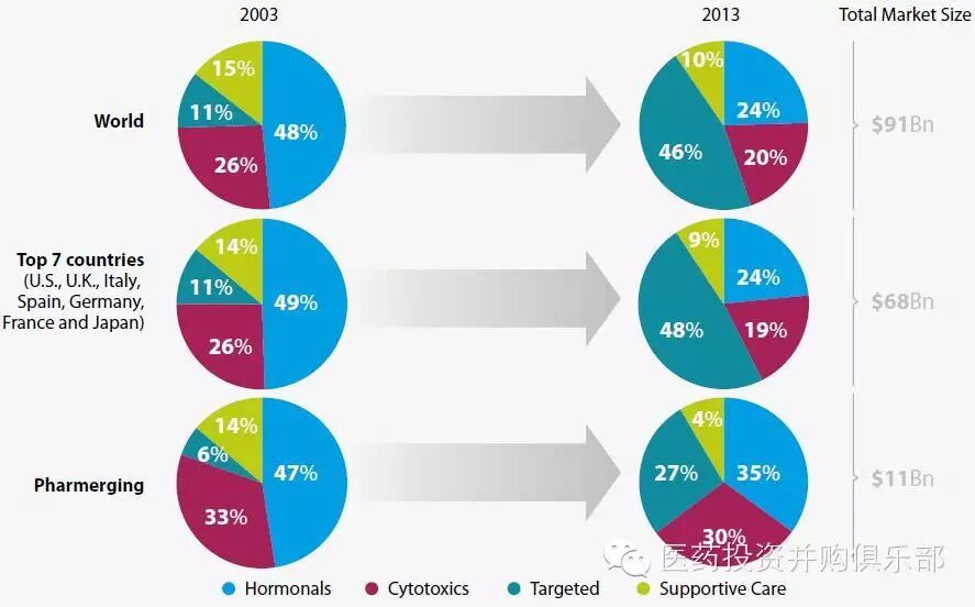 过去10年全球抗肿瘤领域的用药结构同样发生了很大的变化,2003年抗肿瘤激素类药物占据了48%的市场份额,但2013年该比例已下降至24%,取而代之的是靶向治疗药物(46%)。此外,发达国家与新兴市场国家在用药结构上也存在较大差异,靶向治疗药物在新兴市场国家占比仅为27%,较全球平均水平低19个百分点。