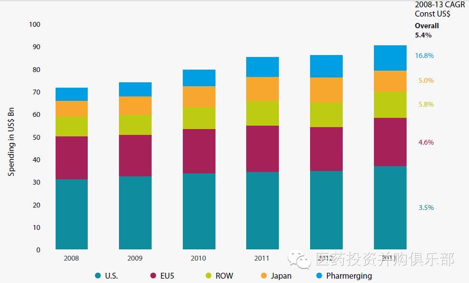 从区域上来看,美国、欧盟5国及日本仍旧是全球抗肿瘤药物市场的主力军,2013年分别占全球肿瘤药物市场41%、24%、10%的市场份额。医药新兴市场国家(中国、巴西、俄罗斯、印度等21个国家)虽然目前仅占有12%的市场份额,但增长迅速,2008-2013年间CAGR16.8%,远超其余区域。