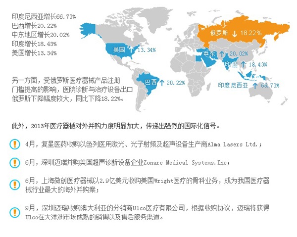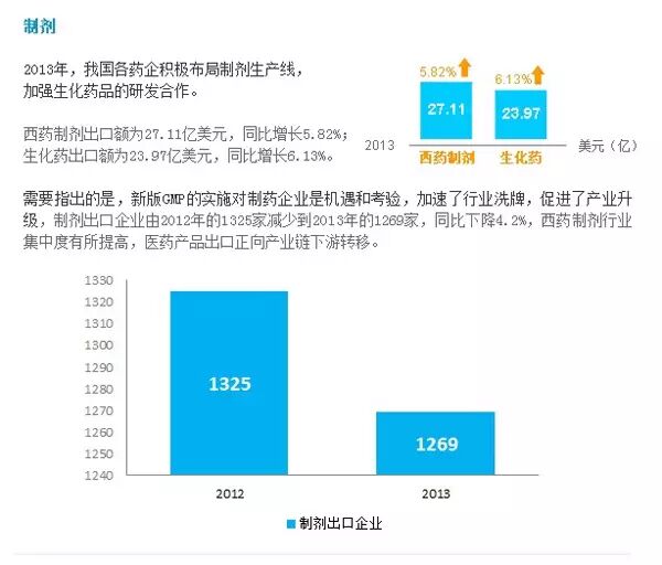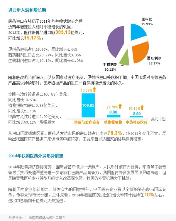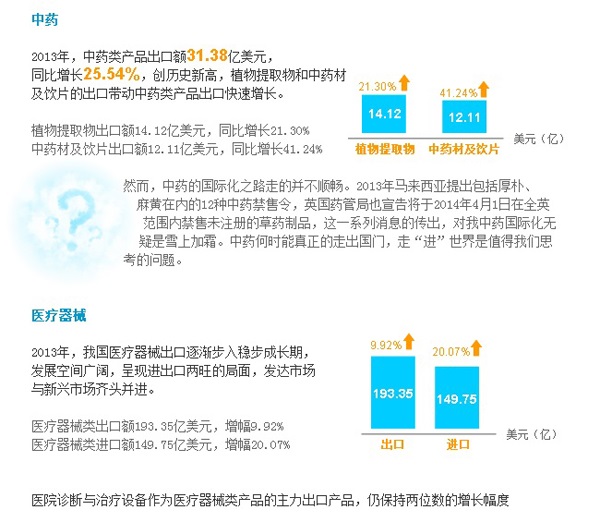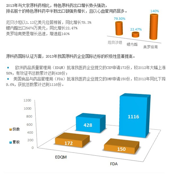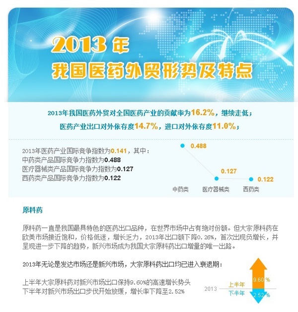 2013年我国医药外贸对全国医药产业的贡献率为16.2%,继续走低;医药产业出口对外依存度14.7%,进口对外依存度11.0%。原料药一直是我国最具特色的医药出口品种,在世界市场中占有绝对份额。但大宗原料药在欧美市场接近饱和,价格低迷,增长乏力,2013年出口额下降0.26%,首次出现负增长,并呈现进一步下降的趋势,新兴市场成为我国大宗原料药出口增量的唯一出路。
