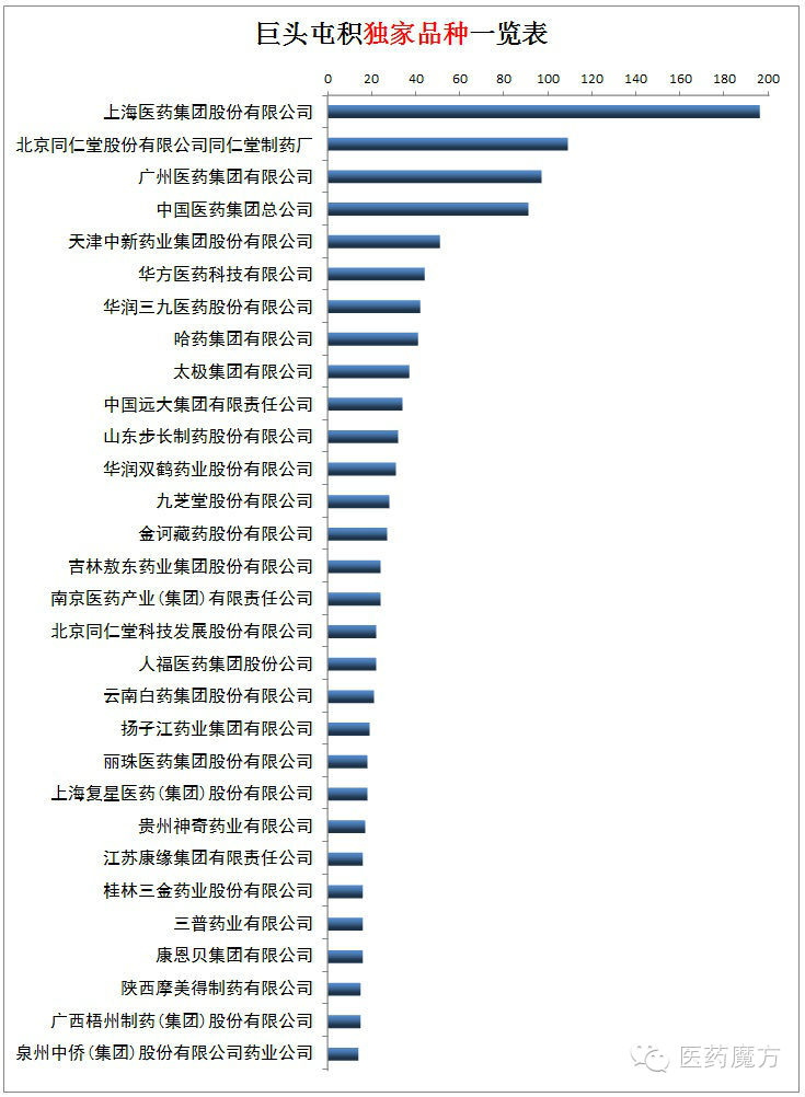 3.独家产品=独家品种+独家剂型。莫混淆独家品种与独家产品的概念。至于具体的标准界定,是非常复杂的问题,涉及到如何统计成盐修饰、是否纳入进口药品等诸多问题。我在早期文章中有所论述,此处不再重复。