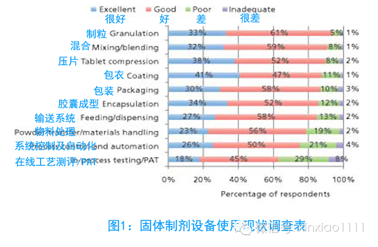 现有的固体制剂设备总体上还是都能满足工业生产的需要。但就工艺指标分析技术的应用超过1/3的受访者都表示对此信心不足(如图1所示)。