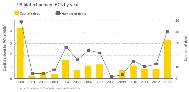 首次公开募股(IPO)创历史新高。50家生物技术公司(在美国,加拿大和欧洲)2013年进行首次公开募股(IPO),融资规模增长了35亿美元,较2012年增长300%,成为自2000年以来最高的一年。
