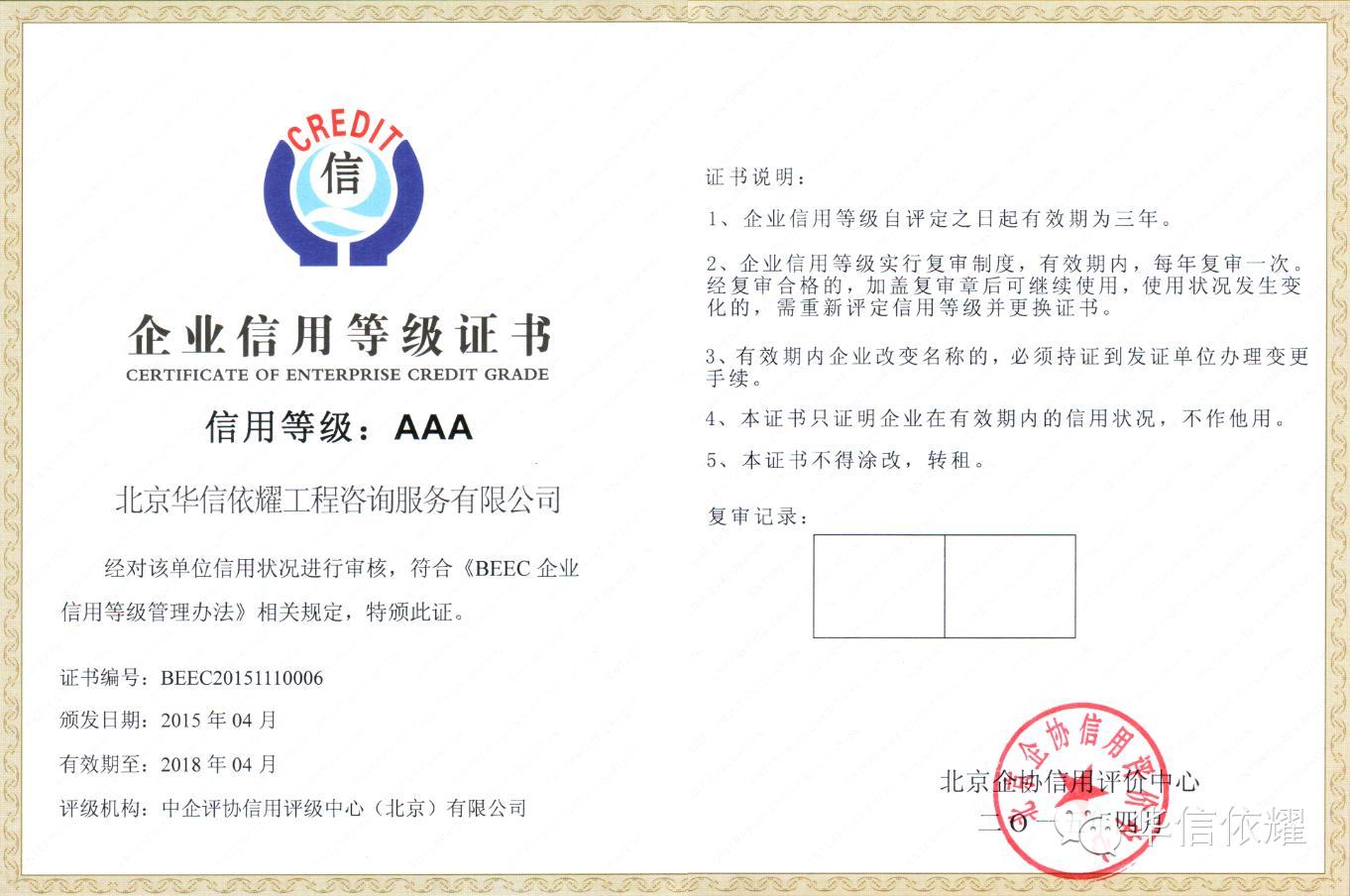 2015年4月15日本公司顺利通过评审部门对本公司以往信用状况的审核,并荣获“3A级企业信用等级证书”。(北京工商局网站、中国人民银行网站均可查询)