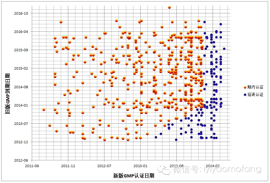 2、横轴日期为取得新版GMP证书的日期,纵轴为旧版GMP证书截至的有效期限。