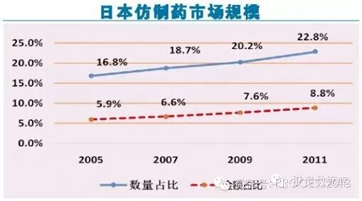 2005年,仿制药占日本医药市场的16.8%。2007年,日本厚生劳动省公布《促进通用名药用药安全行动计划》,提出到2012年仿制药市场份额要达到30%的目标。据估算,如果达成这一目标,5年内将为日本节省约5000亿日元的医疗开支。最新数据显示,2011年,仿制药比例上升至22.8%。由此估算,到2013年,日本已经基本达成这一目标。