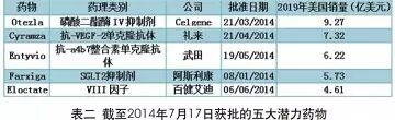 另外,值得注意的还有礼来公司的Cyramza,两年前就被行业分析师寄予厚望,预计5年后在美国的销量将达到7.32亿美元。同时,武田的Entyvio、阿斯利康的Farxiga、百健艾迪的Eloctate也都被视为潜力药物(见表二)。