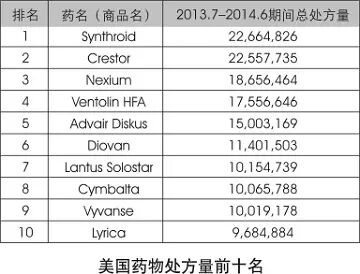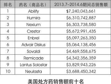 作为美国销售额最高的处方药,2013年07月至2014年06月期间,抗精神病药物阿立哌唑(Abilify,大冢制药)销售额高达72亿美元;其次是关节炎治疗药物阿达木单抗(Humira,艾伯维),63亿美元;埃索美拉唑(Nexium,阿斯利康),63亿美元;瑞舒伐他汀(Crestor,阿斯利康),56亿美元;以及关节炎治疗药物依那西普(恩利,安进公司),接近51亿美元。